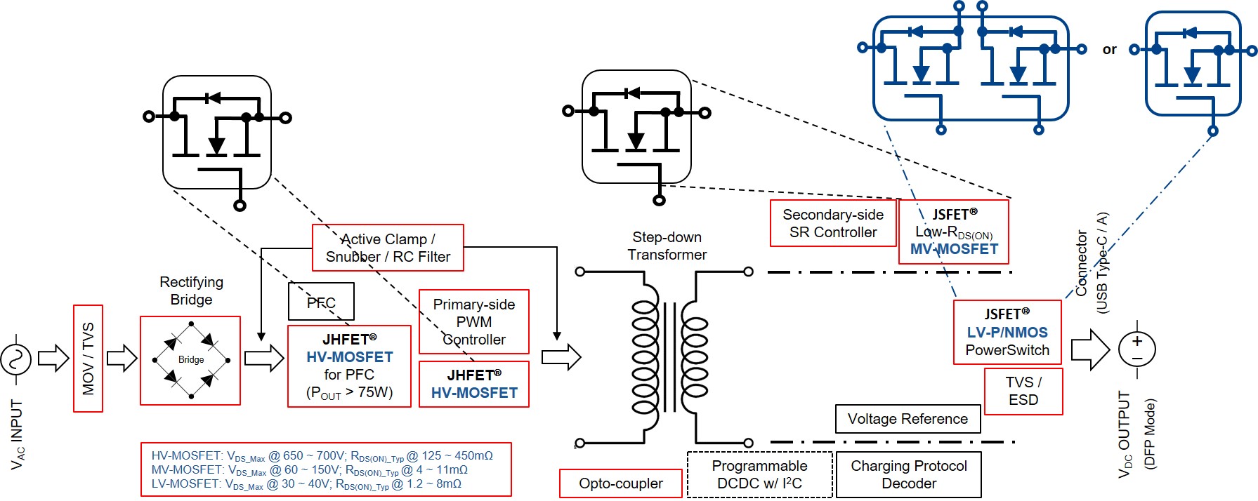 不論在原邊使用的是傳統(tǒng)的超結(jié)高壓 MOSFET、或是日益受電路設(shè)計(jì)工程師及消費(fèi)者追捧的氮化鎵 D/E-mode HEMT,在拓?fù)涞母边?,捷捷微電先進(jìn) JHFET? 技術(shù)平臺(tái)超結(jié) (super-junction) 的高壓 MOSFETs 在原邊開(kāi)關(guān)、先進(jìn) JSFET? 技術(shù)平臺(tái)的中/低壓 MOSFETs 在同步整流和在 USB-C? 端口電流輸出開(kāi)關(guān)等位置,都能提供穩(wěn)定可靠而高功效的運(yùn)作。
