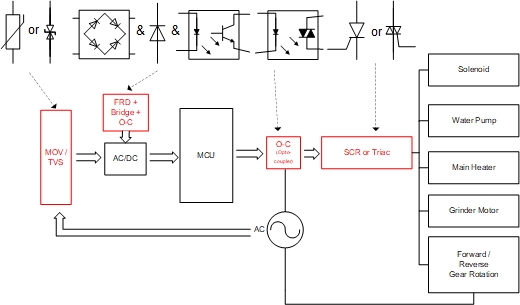 應(yīng)用于消費(fèi)電子領(lǐng)域,捷捷微電 能提供比較齊全的元件解決方案。比如:AC 輸入端防浪涌的壓敏電阻(MOV)、電源部分用快恢復(fù)二極管(FRD, fast recovery diode)及整流橋(Bridge)、光電隔離器件(Opto-coupler)、控制負(fù)載通斷的可控硅(SCR & Triac)等。