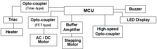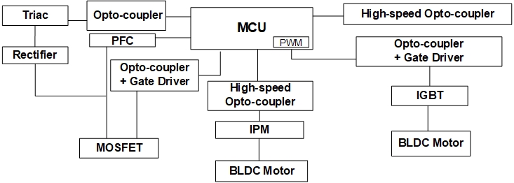 在全球氣候變暖的當(dāng)下,空調(diào)在白色家電中占有舉足輕重的地位。典型的空調(diào)系統(tǒng)由室外機、室內(nèi)機和電源單元組成。對于電源單元,捷捷微電 具有高隔離電壓光電耦合器,用于隔離 PWM 和 PFC。對于室內(nèi)機,MCU 控制與光電耦合器結(jié)合的風(fēng)扇模塊、與光電三端雙向可控硅開關(guān)和外圍設(shè)備結(jié)合的加熱器開關(guān)。主隔離 MCU 和相關(guān)外圍設(shè)備,確保電路的可靠性。對于室外機,使用 MCU 控制風(fēng)扇和壓縮機的電機系統(tǒng)。電機控制系統(tǒng)是各種家用電器的組成部分。每一個單獨模塊都取決于安全和環(huán)境保護要求、性能要求,當(dāng)然還有制造成本。因此,在設(shè)計家用電器時,需要加強對單片機和外圍設(shè)備對應(yīng)用電路的隔離,以確保電路的低噪聲。