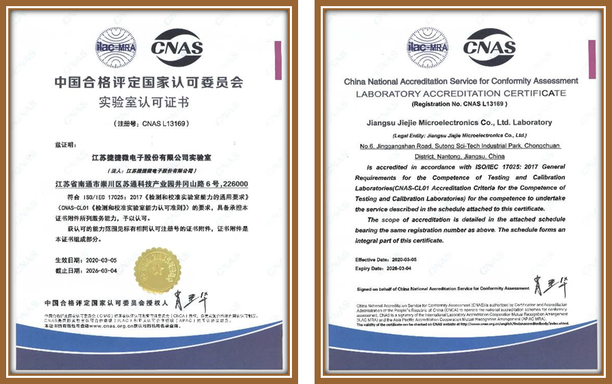捷捷微電子股份有限公司實驗室已經(jīng)獲得中國合格評定國家認可委員會的實驗室認可證書(CNAS認證)
